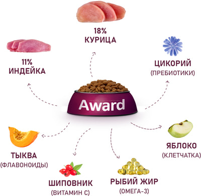 Сухой корм AWARD для взрослых собак крупных пород с курицей и индейкой с добавлением тыквы и шиповника