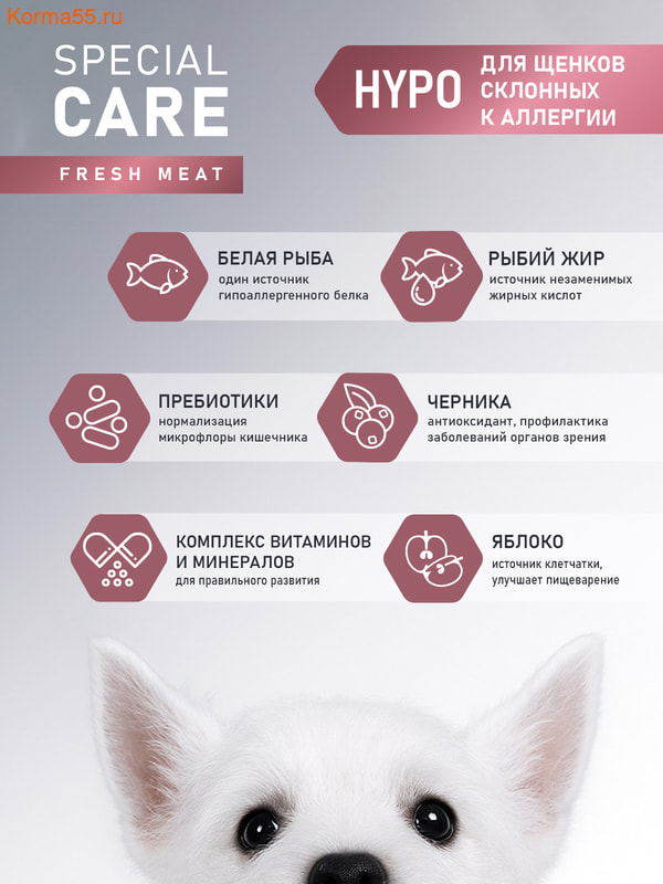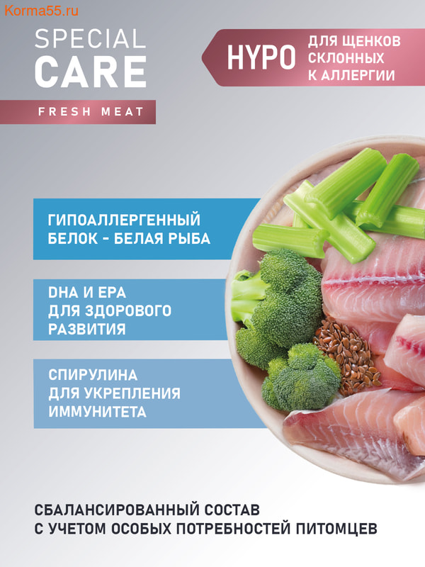 Для щенков от 1 месяца, беременных и кормящих собак всех пород, склонных к аллергии, со свежей белой рыбой