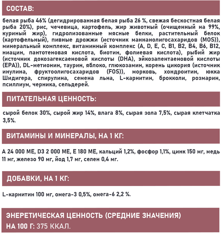 СОСТАВ: белая рыба 46% (дегидрированная белая рыба 26 %, свежая бескостная белая рыба 20%), рис, чечевица, картофель, жир животный (очищенный на 99%, куриный жир), гидролизованные мясные белки, растительный белок (картофельный), пивные дрожжи (источник маннанолигосахаридов (MOS)), минеральный комплекс, витаминный комплекс (A, D, E, С, В1, В2, В4, B6, В12, ниацин, пантотеновая кислота, биотин, фолиевая кислота), рыбий жир (источник докозагексаеновой кислоты (DHA), эйкозапентаеновой кислоты (EPA)), DL-метионин, таурин, яблоко, глюкозамин, корень цикория (источник инулина, фруктоолигосахаридов (FOS)), морковь, хондроитин, юкка Шидигера, спирулина, семена льна, L-карнитин, брокколи, розмарин, псиллиум, черника, сельдерей.