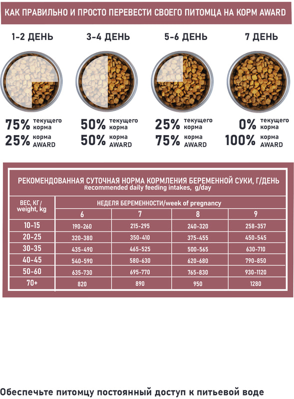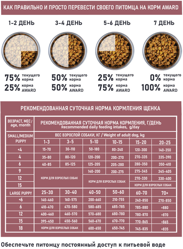 РЕКОМЕНДАЦИИ ПО ПРИМЕНЕНИЮ: Индивидуальные потребности в питании могут отличаться в зависимости от размера, возраста и активности питомца. У собаки всегда должен быть доступ к свежей питьевой воде. Для щенков: рекомендуемую ежедневную порцию корма (см. таблицу) можно разделить на три и более кормления. Рекомендуется вводить корм в рацион питомца постепенно в течение недели. Для сук во время беременности и лактации: рекомендуется вводить данный корм в рацион, начиная с 6-й недели беременности постепенно (минимум в течение недели). По назначению ветеринарного специалиста возможно кормление на более раннем сроке. Во время лактации и кормления щенков корм потребляется без ограничений. Корм предназначен исключительно для домашних животных и не предназначен для употребления в пищу человеком.