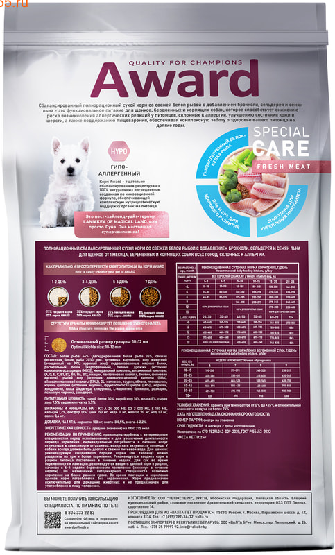 Корм Award - тщательно сбалансированная рецептура из 100% натуральных ингредиентов, созданная по инновационной формуле, обеспечивающей комплексную нутрицевтическую поддержку организма питомца.