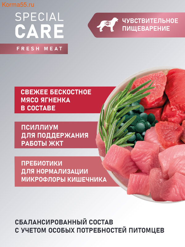 Сбалансированный полнорационный сухой корм со свежим мясом ягненка с добавлением спирулины и розмарина - это функциональное питание для взрослых собак всех пород, которое поддерживает баланс микрофлоры кишечника и улучшает пищеварение, обеспечивая комплексную заботу о здоровье вашего питомца на долгие годы.