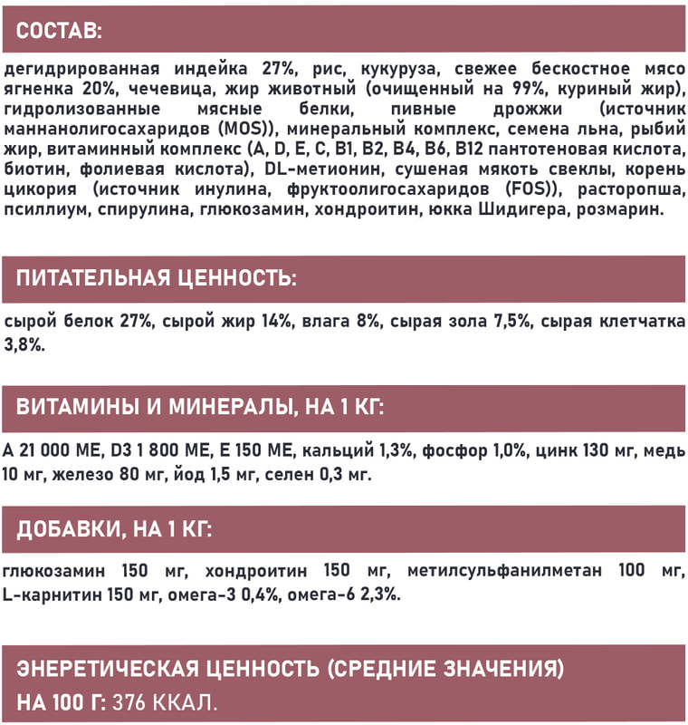 СОСТАВ: дегидрированная индейка 27%, рис, кукуруза, свежее бескостное мясо ягненка 20%, чечевица, жир животный (очищенный на 99%, куриный жир), гидролизованные мясные белки, пивные дрожжи (источник маннанолигосахаридов (MOS)), минеральный комплекс, семена льна, рыбий жир, витаминный комплекс (A, D, E, C, B1, B2, B4, B6, B12 пантотеновая кислота, биотин, фолиевая кислота), DL-метионин, сушеная мякоть свеклы, корень цикория (источник инулина, фруктоолигосахаридов (FOS)), расторопша, псиллиум, спирулина, глюкозамин, хондроитин, юкка Шидигера, розмарин.