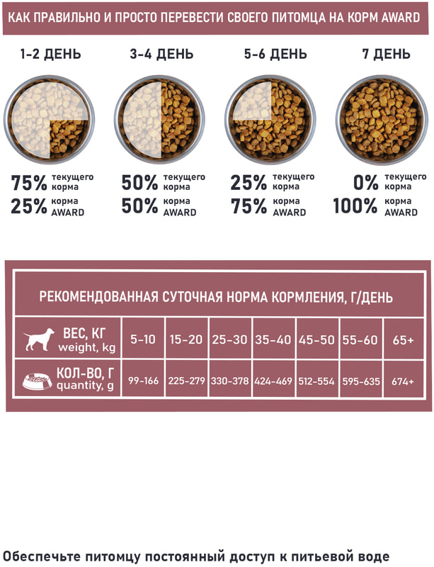 РЕКОМЕНДАЦИИ ПО ПРИМЕНЕНИЮ: рекомендуемую ежедневную порцию корма (см. таблицу) можно разделить на два кормления. индивидуальные потребности в питании могут отличаться в зависимости от размера, возраста и активности питомца. У собаки всегда должен быть доступ к свежей питьевой воде. Рекомендуется вводить корм в рацион питомца постепенно в течение недели. Корм предназначен исключительно для домашних животных и не предназначен для употребления в пищу человеком.