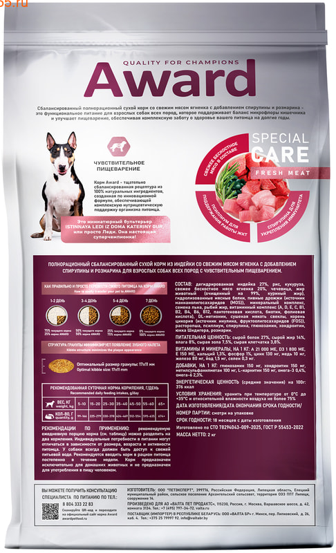Корм Award - тщательно сбалансированная рецептура из 100% натуральных ингредиентов, созданная по инновационной формуле, обеспечивающей комплексную нутрицевтическую поддержку организма питомца.