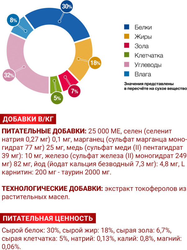 Питательные добавки на кг: витамин А (ретинола ацетат) 25 000 МЕ, селен (селенит натрия 0,27 мг) 0,1 мг, марганец (сульфат марганца моногидрат 77 мг) 25 мг, медь (сульфат меди (II) пентагидрат 39 мг): 10 мг, железо (сульфат железа (II) моногидрат 249 мг) 82 мг, йод (йодат кальция безводный 7,3 мг): 4,8 мг, L карнитин: 200 мг, таурин 2000 мг.