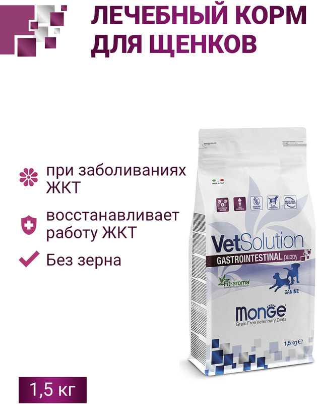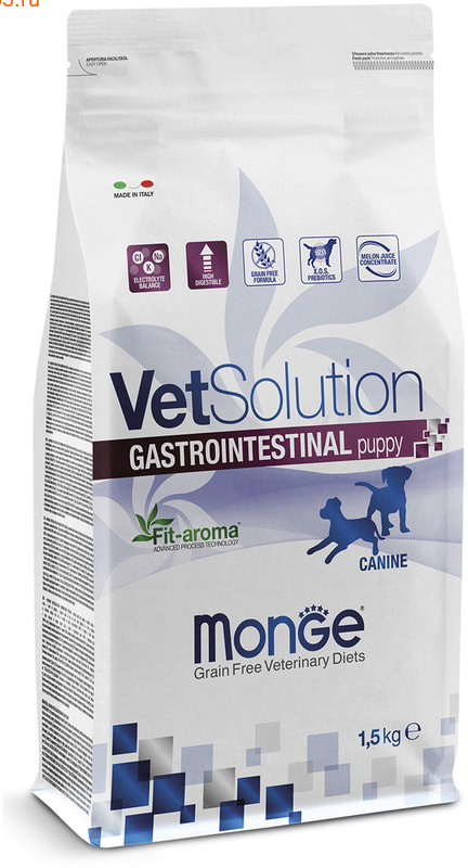 Monge (Монж/Монже) VetSolution Gastrointestinal Puppy — полнорационный сухой диетический корм из курицы для щенков «Gastrointestinal » для устранения симптомов расстройства пищеварения у щенков. Содержит концентрат сока дыни для нейтрализации свободных радикалов. Fit-aroma: конский каштан для поддержания здоровья кишечника, ксилоолигосахариды (XOS) для защиты микробиоты кишечника и повышенный уровень натрия и калия, и легкоусвояемых ингредиентов.