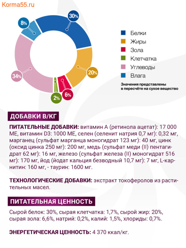 Питательные добавки: витамин А (ретинола ацетат): 17 000 МЕ, витамин D3: 1000 МЕ, селен (селенит натрия 0,36 мг): 0,17 мг, марганец (сульфат марганца моногидрат 105 мг): 34 мг, медь (сульфат меди (II) пентагидрат 53 мг): 13.5 мг, железо (сульфат железа (II) моногидрат 343 мг): 112,8 мг, йод (йодат кальция безводный 10 мг): 6.5 мг, L-карнитин: 160 мг, - таурин: 1600 мг.
