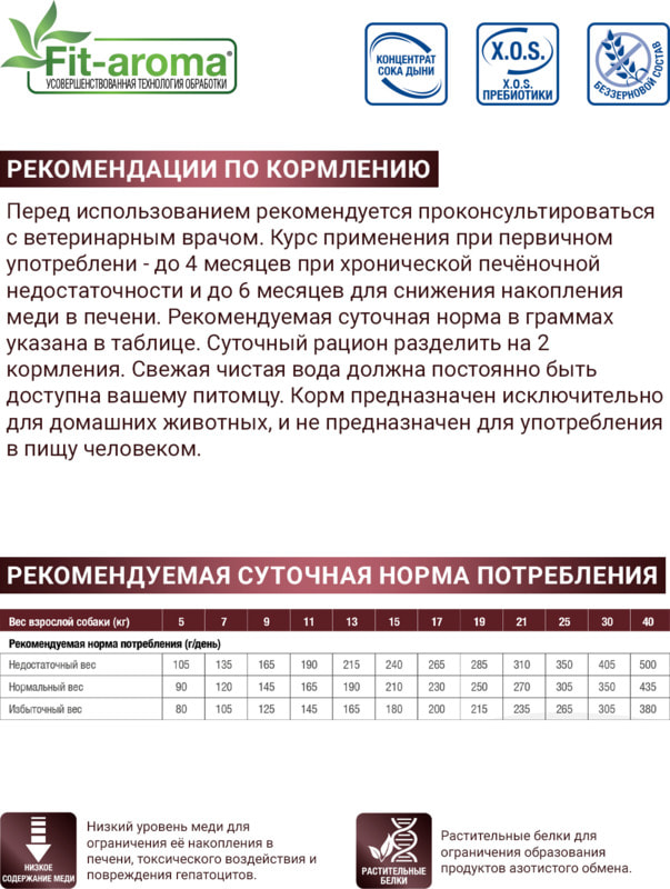 Перед использованием рекомендуется проконсультироваться с ветеринарным врачом. Курс применения при первичном употреблении - до 4 месяцев при хронической печёночной недостаточности, до 6 месяцев для снижения накопления меди в печени. Рекомендуемая суточная норма в граммах указана в таблице. Суточный рацион разделить на 2 кормления. Свежая чистая вода должна постоянно быть доступна вашему питомцу. Корм предназначен исключительно для домашних животных, и не предназначен для употребления в пищу человеком.