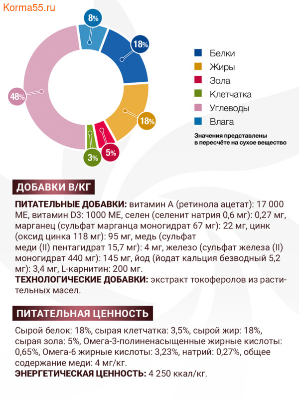 сырой белок: 18%, сырая клетчатка: 3,5%, сырой жир: 18%, сырая зола: 5%, Омега-3 жирные кислоты: 0,65%, Омега-6 жирные кислоты: 3,23%, натрий: 0,27%, общее содержание меди: 4 мг/кг.