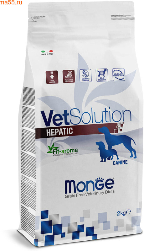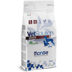 Monge (Монж/Монже) VetSolution Hepatic — полнорационный сухой диетический корм для собак «Hepatic» для поддержания функции печени у собак при хронической печеночной недостаточности и снижения накопления меди в печени. Содержит концентрат сока дыни для нейтрализации свободных радикалов. Fit-aroma: семена расторопши для поддержки печени, ксилоолигосахариды (XOS) для защиты микробиоты кишечника. Формула характеризуется умеренным уровнем отборного высококачественного белка и пониженным уровнем меди.