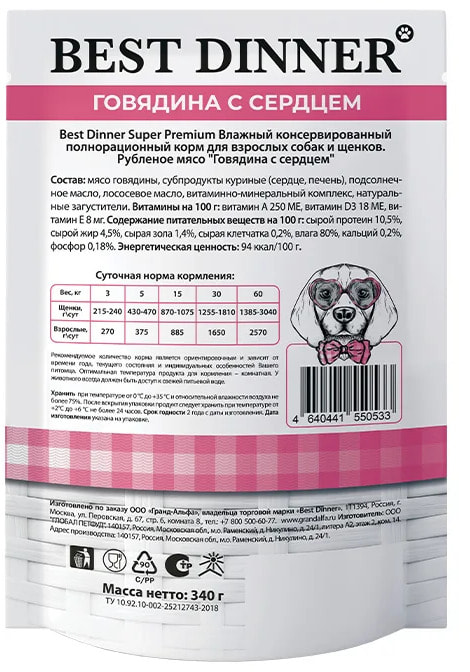 Рацион разработан с учетом физиологических особенностей взрослых собак и щенков всех пород. Говядина обладает высокой вкусовой привлекательностью и является источникам полноценного животного белка, необходимого для восстановления мышц и кроветворения, а также коллагена и эластина, поддерживающих здоровье суставов. Сердце обогащает рацион минералами и аминокислотами, а также витаминами В6 и В12. Натуральные жиры и масла обеспечивают рацион незаменимыми жирными кислотами, снижающими воспалительные процессы и поддерживающими здоровье кожи и шерсти. Best Dinner Super Premium "Говядина с сердцем" изготовлен только из натуральных компонентов без искусственных красителей, консервантов и ароматизаторов, обогащен всеми необходимыми витаминами и минеральными веществами.