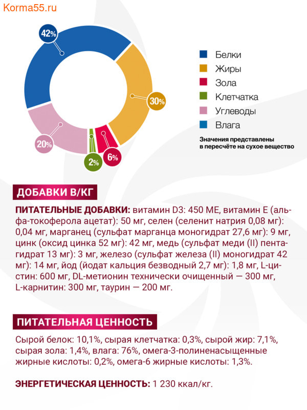 Питательные добавки на кг: витамин D3: 450 МЕ, витамин Е (альфа-токоферола ацетат): 50 мг, селен (селенит натрия 0,08 мг): 0,04 мг, марганец (сульфат марганца моногидрат 27,6 мг): 9 мг, цинк (оксид цинка 52 мг): 42 мг, медь (сульфат меди (II) пентагидрат 13 мг): 3 мг, железо (сульфат железа (II) моногидрат 42 мг): 14 мг, йод (йодат кальция безводный 2,7 мг): 1,8 мг, L-цистин: 600 мг, DL-метионин технически чистый - 300 мг, L-карнитин: 300 мг, таурин – 200 мг.