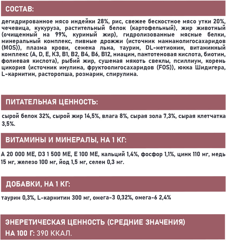 СОСТАВ: дегидрированное мясо индейки 28%, рис, свежее бескостное мясо утки 20%, чечевица, кукуруза, растительный белок (картофельный), жир животный (очищенный на 99%, куриный жир), гидролизованные мясные белки, минеральный комплекс, пивные дрожжи (источник маннанолигосахаридов (MOS)), плазма крови, семена льна, таурин, DL-метионин, витаминный комплекс (А, D, E, К3, В1, В2, В4, В6, В12, ниацин, пантотеновая кислота, биотин, фолиевая кислота), рыбий жир, сушеная мякоть свеклы, псиллиум, корень цикория (источник инулина, фруктоолигосахаридов (FOS)), юкка Шидигера, L-карнитин, расторопша, розмарин, спирулина.