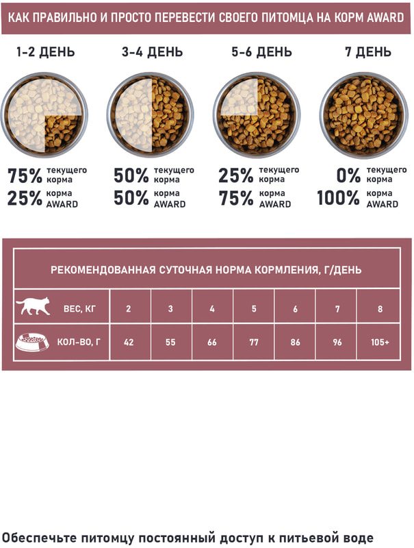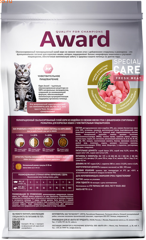 Корм Award - тщательно сбалансированная рецептура из 100% натуральных ингредиентов, созданная по инновационной формуле, обеспечивающей комплексную нутрицевтическую поддержку организма питомца.