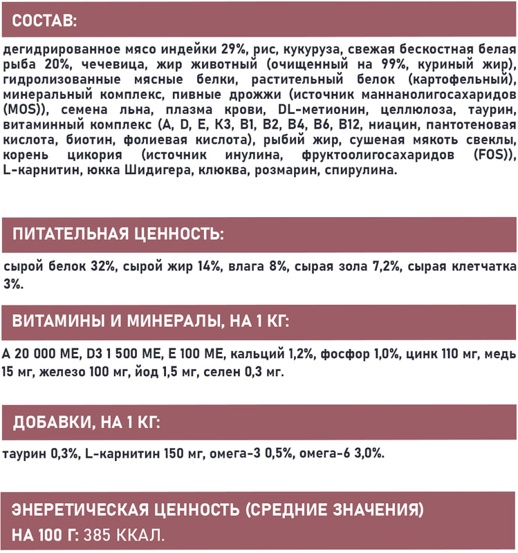 СОСТАВ: дегидрированное мясо индейки 29%, рис, кукуруза, свежая бескостная белая рыба 20%, чечевица, жир животный (очищенный на 99%, куриный жир), гидролизованные мясные белки, растительный белок (картофельный), минеральный комплекс, пивные дрожжи (источник маннанолигосахаридов (MOS)), семена льна, плазма крови, DL-метионин, целлюлоза, таурин, витаминный комплекс (А, D, E, К3, В1, В2, В4, В6, В12, ниацин, пантотеновая кислота, биотин, фолиевая кислота), рыбий жир, сушеная мякоть свеклы, корень цикория (источник инулина, фруктоолигосахаридов (FOS)), L-карнитин, юкка Шидигера, клюква, розмарин, спирулина.