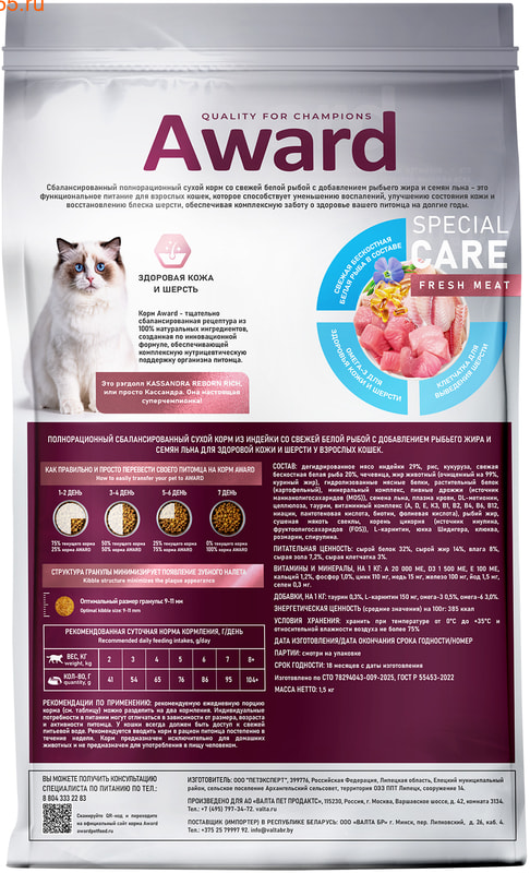 Сухой корм AWARD SPECIAL CARE Sensitive Skin&Coat для кошек