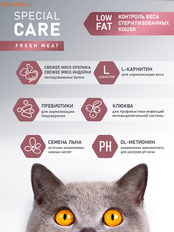 - Рацион со сниженным содержанием жира и пониженной калорийность для кошек с избыточной массой тела и склонных к набору лишнего веса.