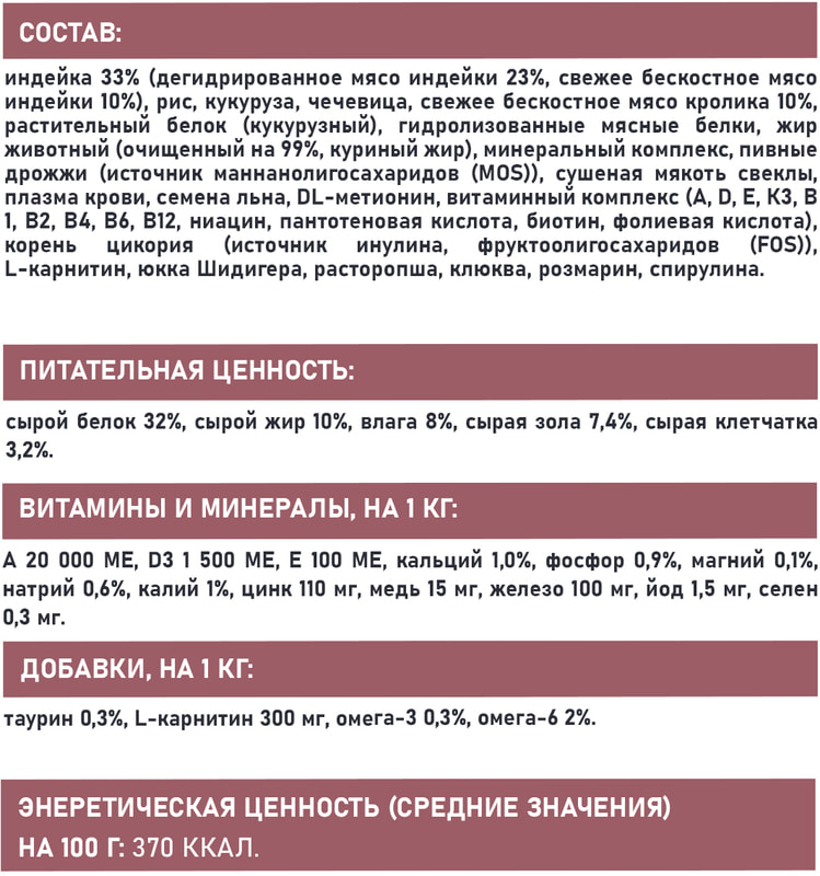 СОСТАВ: индейка 33% (дегидрированное мясо индейки 23%, свежее бескостное мясо индейки 10%), рис, кукуруза, чечевица, свежее бескостное мясо кролика 10%, растительный белок (кукурузный), гидролизованные мясные белки, жир животный (очищенный на 99%, куриный жир), минеральный комплекс, пивные дрожжи (источник маннанолигосахаридов (MOS)), сушеная мякоть свеклы, плазма крови, семена льна, DL-метионин, витаминный комплекс (А, D, E, К3, В1, В2, В4, В6, В12, ниацин, пантотеновая кислота, биотин, фолиевая кислота), корень цикория (источник инулина, фруктоолигосахаридов (FOS)), L-карнитин, юкка Шидигера, расторопша, клюква, розмарин, спирулина.