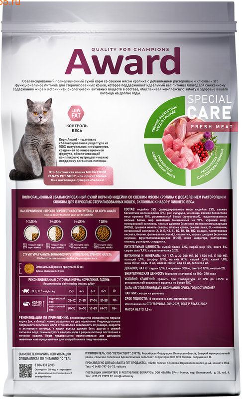 Отзывы - Сухой корм AWARD SPECIAL CARE Weight ControlОставить отзыв