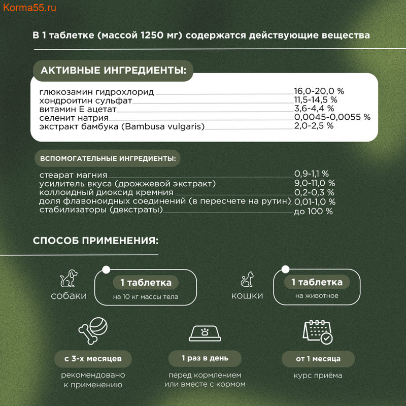 В 1 таблетке (массой 1250 мг) содержится в качестве действующих веществ: глюкозамин гидрохлорид – 16,0-20,0 %, хондроитин сульфат – 11,5-14,5 %, витамин Е ацетат – 3,6-4,4 %, селенит натрия – 0,0045-0,0055 %, экстракт бамбука 70 % – 2,0-2,5 %, в качестве вспомогательных веществ: стеарат магния – 0,9-1,1 %, усилитель вкуса (D Tech 8P) – 9,0-11,0 %, коллоидный диоксид кремния – 0,2-0,3 %, стабилизатор (декстракты) – до 100 %, доля флавоноидных соединений (в пересчете на рутин) – 0,01-1,0. Содержание влаги – не более 8 %.Ингредиенты