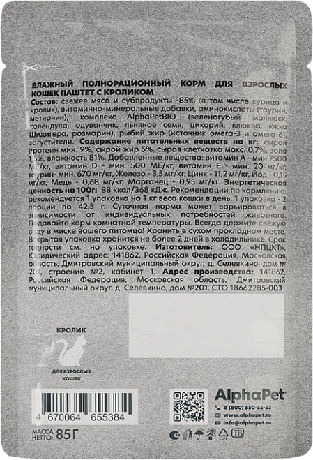 Влажный корм AlphaPet WOW паштет с кроликом 85гр для кошек