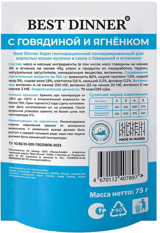 Состав: мясо и мясные ингредиенты (в том числе мясо говядины не менее 4% и ягненка не менее 4%), злаки и продукты их переработки, таурин, натуральные загустители, минеральные вещества, витамины